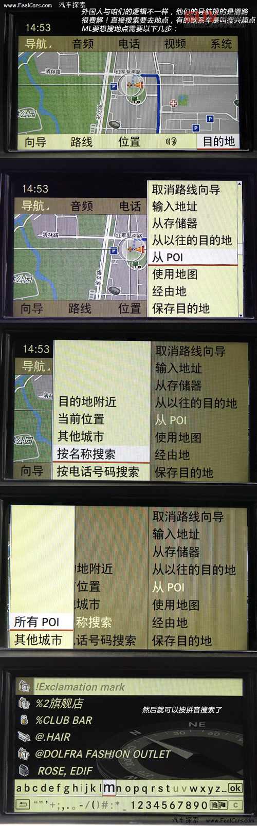 國外的車導(dǎo)航思維邏輯奇怪,一般我們搜導(dǎo)航直接就是搜某某大樓,某某酒店,可不光奔馳還有別的品牌,打開搜索選項,搜的是街道。COMAND要搜地點就得好幾步,而有的品牌則是叫搜索興趣點。
