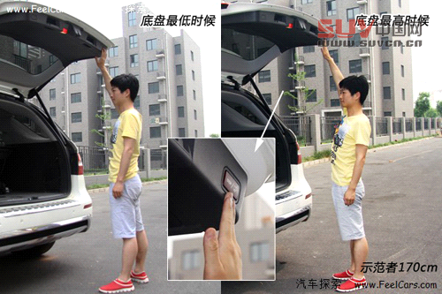 后備箱門開關(guān)的高度屬于剛好能夠著,即使是底盤升到最高。170cm的示范者在底盤最高的時候能夠剛好夠著,如果矮點的人墊個腳也能夠夠著。