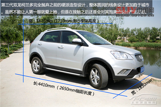 從外形看來,柯蘭多并不是一眼就能愛上的類型。相反的,柯蘭多外形設計圓潤,沒有過多的棱角設計。慢慢的你會喜歡這個圓鼓鼓的家伙。相比較于前兩代車型,放棄了非承載車身的它,無論在外形上和底盤動力上,都更具城市氣息。第三代柯蘭多外形尺寸為長:4410mm(軸距2650mm),寬:1830mm,高:1710mm,這樣的尺寸在同級別車型中表現中規中矩。