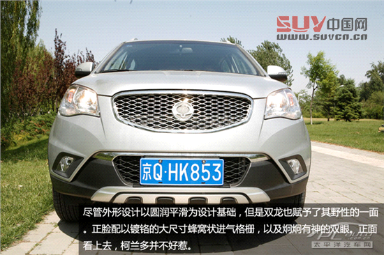 盡管外形設計以圓潤平滑為設計基礎,但是雙龍也賦予了其野性的一面。正臉配以鍍鉻的大尺寸蜂窩狀進氣格柵,以及炯炯有神的雙眼。正面看上去,柯蘭多并不好惹。