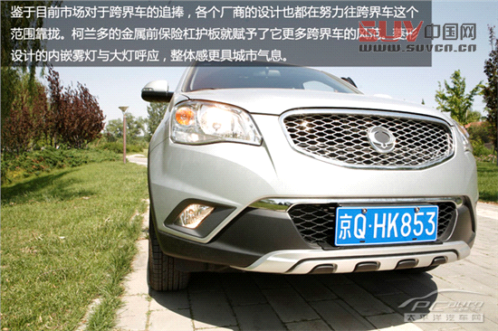 鑒于目前市場對于跨界車的追捧,各個廠商的設計也都在努力往跨界車這個范圍靠攏。柯蘭多的金屬前保險杠護板就賦予了它更多跨界車的風范。菱形設計的內嵌霧燈與大燈呼應,整體感更具城市氣息。