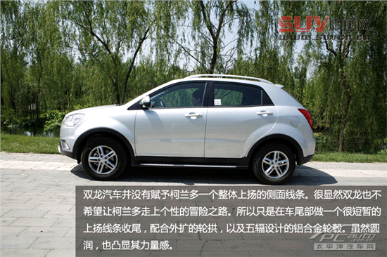 雙龍汽車并沒有賦予柯蘭多一個整體上揚的側面線條。很顯然雙龍也不希望讓柯蘭多走上個性的冒險之路。所以只是在車尾部做一個很短暫的上揚線條收尾,配合外擴的輪拱,以及五輻設計的鋁合金輪轂。雖然圓潤,也凸顯其力量感。