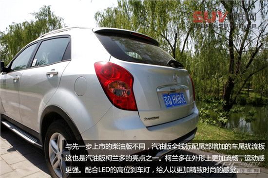 與先一步上市的柴油版不同,汽油版全線標配尾部增加的車尾擾流板。這也是汽油版柯蘭多的亮點之一。柯蘭多在外形上更加流暢,運動感更強。配合LED的高位剎車燈,給人以更加精致時尚的感覺。