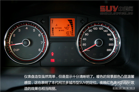 儀表盤造型雖然簡單,但是顯示十分清晰明了。暖色的背景顏色凸顯溫馨感覺,這也表明了本代柯蘭多城市型SUV的定位。夜晚紅色夜光的指針營造的效果也相當絢麗。