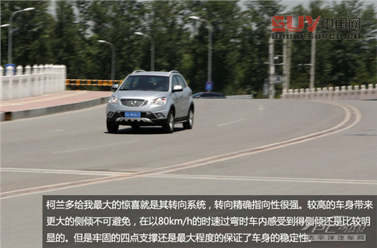 柯蘭多給客戶最大的驚喜就是其轉向系統,轉向精確指向性很強,較高的車身帶來更大的側傾不可避免,在以80km/h的時速過彎時車內感受到得側傾還是比較明顯的。但是牢固的四點支撐還是最大程度的保證了車身的穩定性。