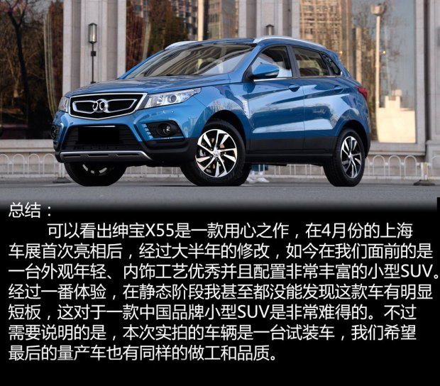 1.5T發(fā)動機、CVT無級變速箱、ESP、無鑰匙進入+一鍵啟動、全景天窗、前后倒車雷達、倒車影像、導(dǎo)航、電動折疊外后視鏡、自動防炫目內(nèi)后視鏡、多連桿獨立后懸架......這些雖然都不是一些非常稀罕的配置,不過它們集體出現(xiàn)在一臺中國品牌的小型SUV上還是頗為罕見的,而紳寶X55就是這么一款車。在如今非常火爆的小型SUV市場,作為一個配置控的紳寶X55(下文簡稱X55)能否爭得一席之地,讓我們一起來看看。