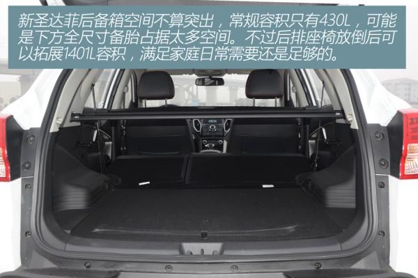 新圣達菲后備箱空間不算突出,常規容積只有430L,可能是下方全尺寸備胎占據太多空間。不過后排座椅放倒后可以拓展1401L容積,滿足家庭日常需要還是足夠的。