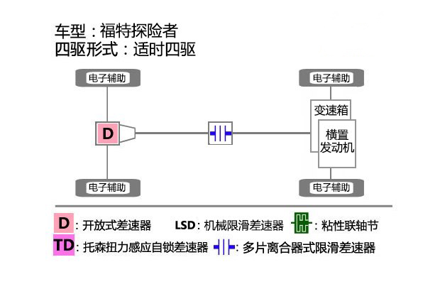 第五代探險者拋棄了之前的非承載式車身,采用了承載式車身結(jié)構(gòu),用來提升更多的公路駕駛能力,搭載的適時四驅(qū)系統(tǒng)和我們一般常見的城市SUV一樣,中央差速機構(gòu)為多片離合器式限滑差速器,后橋輪間為開放式差速器,前后橋左右輪間的限滑功能均依靠電子輔助。探險者上的這套四驅(qū)系統(tǒng)不是為越野而生,是為了為提升公路性能而存在的。