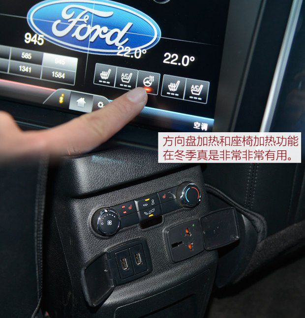 我們試駕的地點氣溫在零下十幾度,在外面呆一會就感覺身體要被凍透了,所有人上車后的第一件事就是打開座椅加熱功能,我們試駕的這款運動版車型前后排都配有此功能,座椅加熱開啟后很快就能感覺到暖意,還是非常給力的,另外探險者的后排提供了兩個USB充電口和一個電源插口,一下解決了冬季電子設(shè)備電池衰退的問題,我想很多朋友都遇到過天氣太冷手機剛拿出來就沒電了,探險者上多個充電口能讓乘客的電子設(shè)備都恢復(fù)活力,后排的電源插座也能給相機充電,這個一定要給好評。