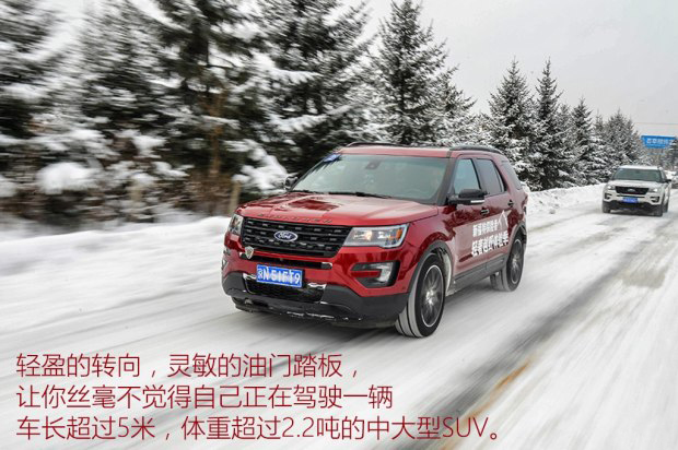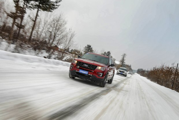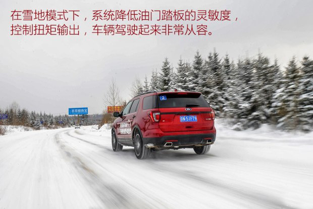 不過靈敏的油門踏板對于冰雪路面的駕駛并不是什么好事,因為路面的附著力低,稍微控制不好力度車身穩(wěn)定系統(tǒng)就會強制介入,好在探險者配備了“路況實時管理系統(tǒng)”。