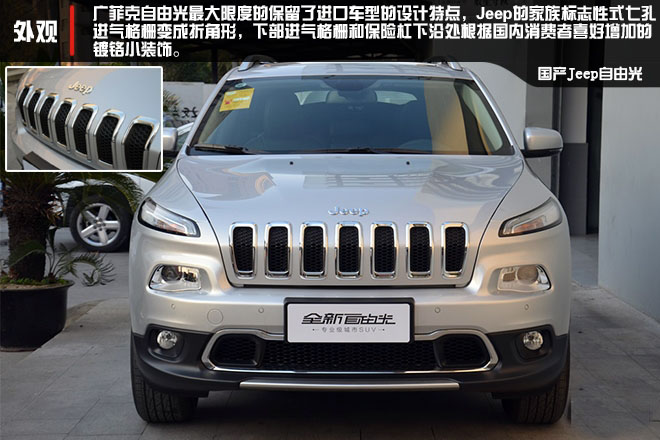 外觀方面,廣菲克自由光最大限度的保留了進口車型的設計特點,Jeep的家族標志性式七孔進氣格柵變成折角形,據(jù)說是為了減低風阻系數(shù)。下部進氣格柵和保險杠下沿處使用了鍍鉻裝飾,相比進口都市版以下車型沒有的鍍鉻裝飾,根據(jù)國內(nèi)消費者喜好增加的鍍鉻小裝飾,可謂是誠意滿滿。