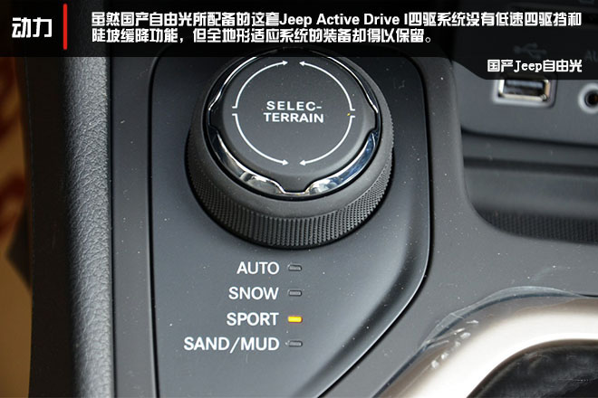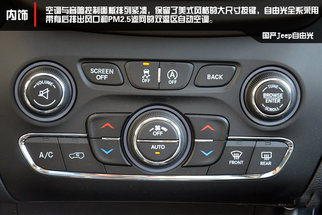 自由光的內(nèi)飾上遠沒有外觀那么時尚,風格屬穩(wěn)重耐看的類型,在用料和工藝上保持了自由光在Jeep家族中的優(yōu)勢。而在配置上,相比進口車型,國產(chǎn)自由光還增加了發(fā)動機啟停功能、主動式進氣格柵、副駕駛座電動調節(jié)功能、新造型雙排氣管、防PM2.5空調濾芯、前排雙層隔音玻璃和發(fā)動機艙隔音加強。在裝配水平進步的同時,還保留了美式風格的大尺寸按鍵。