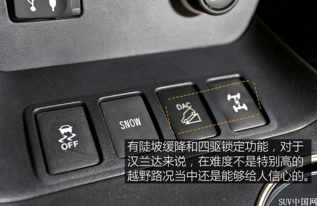 來到了野外,漢蘭達的表現也不狼狽,它關于越野的配置比較豐富,像陡坡緩降和四驅鎖定功能都有了。而且對于漢蘭達的定位來說,傻瓜式操作的功能設計更加適合車主使用,面對不同的場合情景,需要什么按什么,接下來就放心走吧。
