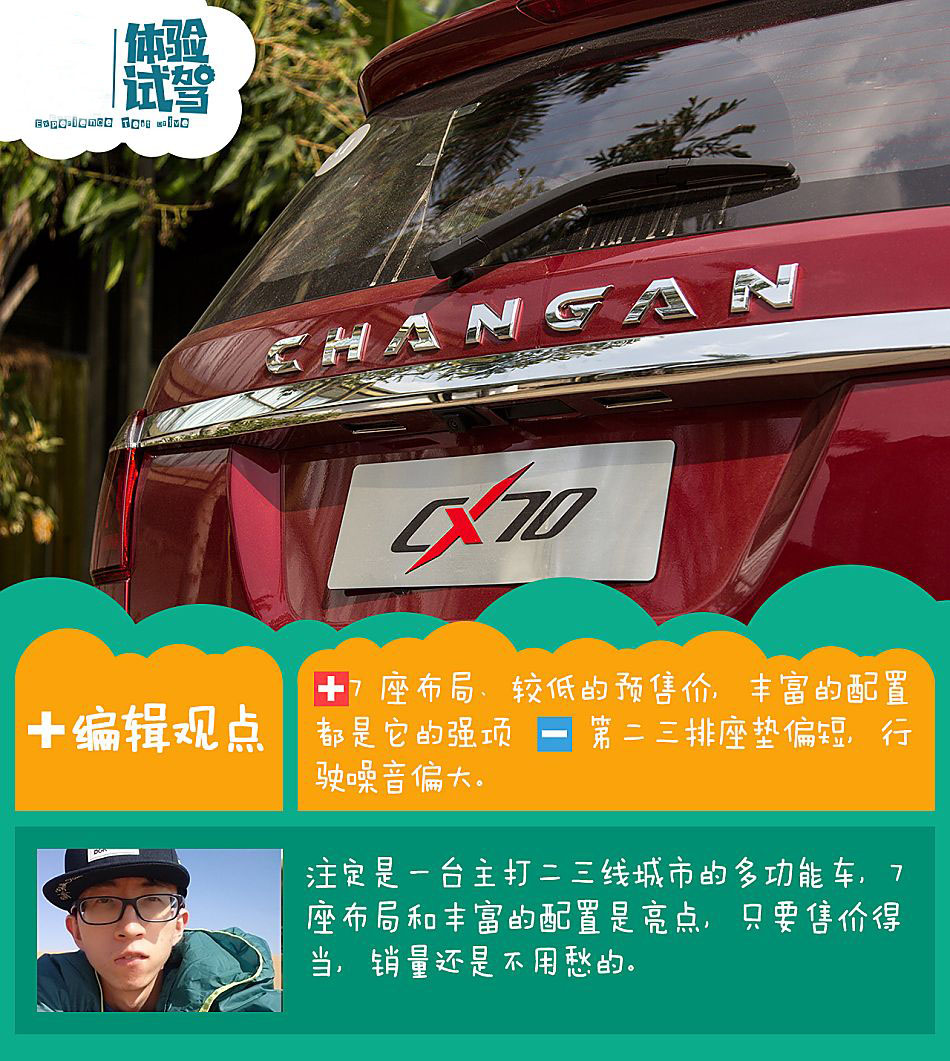 【SUV中國(guó)網(wǎng)】隨著越來越多80后成家立業(yè),作為社會(huì)中堅(jiān)力量的他們對(duì)大空間車的需求正在日益加深。畢竟出去玩兒一趟開著倆車不太方便也比較浪費(fèi)。于是7座SUV和MPV便成了他們的首選。近期,長(zhǎng)安商用車便推出了這么一款大空間7座車型,它給自己的定位是多功能車,不過在我看來,它就是一臺(tái)地地道道的SUV產(chǎn)品,這臺(tái)車被命名為CX70,不過跟CS75有所不同,它是來自長(zhǎng)安商用車。