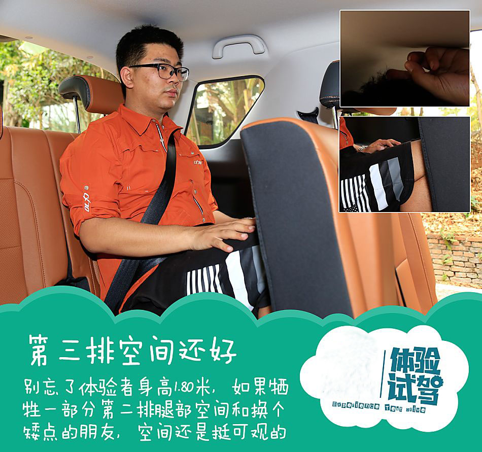 空間方面,體驗(yàn)者擁有1.80米的身高,坐進(jìn)前排還有1拳的頭部空間。第二排同樣如此,腿部為1拳3指,同樣不錯(cuò)的成績(jī)。第三排頭部有所縮減也在情理之中,腿部幾乎沒有余量,但如果將第二排空間縮小點(diǎn),第三排還是能夠有些許空間保證的。取舍之間還需自行調(diào)解。