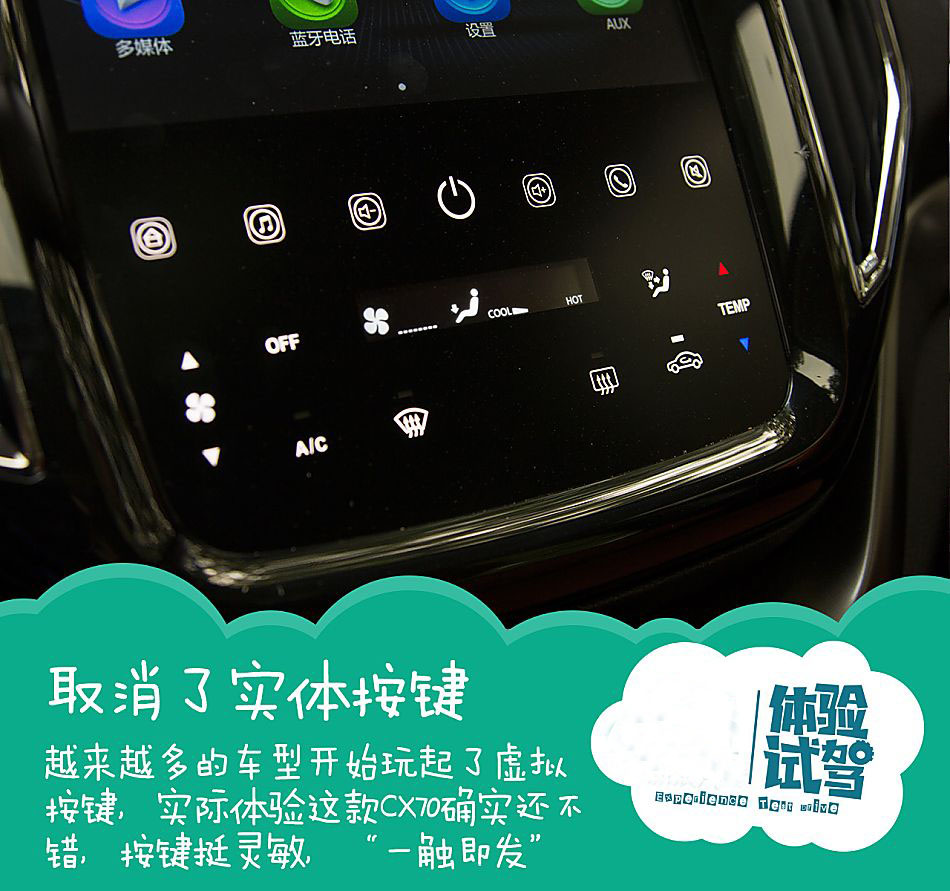 中央顯示屏是整車最大的亮點(diǎn),作為一款定位在CS75之下的車型(售價(jià)也會(huì)比CS75低),長(zhǎng)安CX70使用了一塊兒8英寸觸摸液晶顯示屏,下方是虛擬按鍵區(qū)域,整體看上去就猶如特斯拉那樣的大尺寸豎屏,很有檔次感。在實(shí)際體驗(yàn)下來,該屏幕的顯示效果還算可以,屏幕觸摸和虛擬按鍵觸摸都很靈敏,不會(huì)讓你花精力去顧及這方面事兒??照{(diào)區(qū)域雖為虛擬按鍵,但布局設(shè)計(jì)和常規(guī)車型無異,上手很方便。同時(shí)在按動(dòng)每個(gè)按鍵時(shí)還會(huì)發(fā)出嘀的聲音,以告訴你此次操作的成功與否。