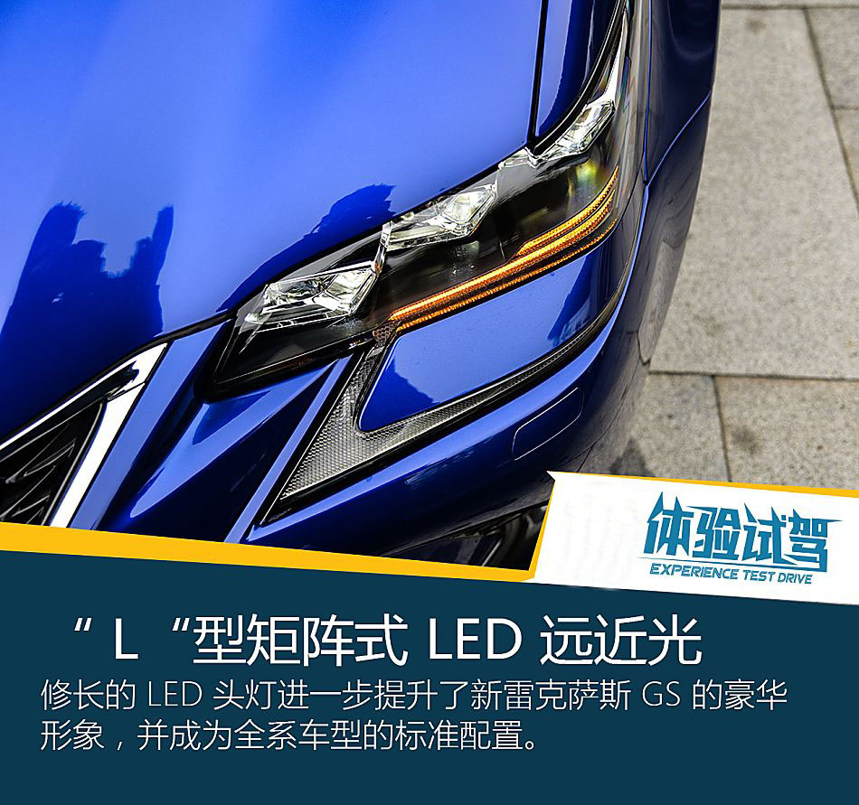 相信許多讀者能在關于雷克薩斯的試駕文章里找到,紡錘形格柵、“ L” 型日間行車燈這幾個元素的過度分析,是如何如何的犀利,如何如何的霸氣,所以在此我就不贅述了!說幾個看不見的地方,1、新GS 300h和GS450h的進氣格柵下方配有一個進氣控制器,通過開啟和關閉進氣格柵來控制發動機艙的進氣量。2、“ L“型矩陣式 LED 遠近光照明大燈,它能夠根據車速自動調節垂直方向的光軸, 從而確保大燈燈光分布的一致性,但很可惜,只有高配車型有。