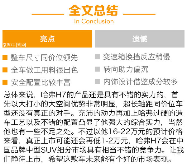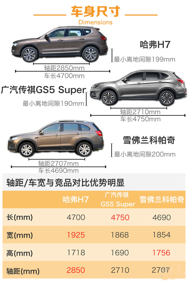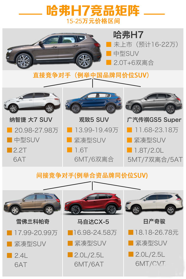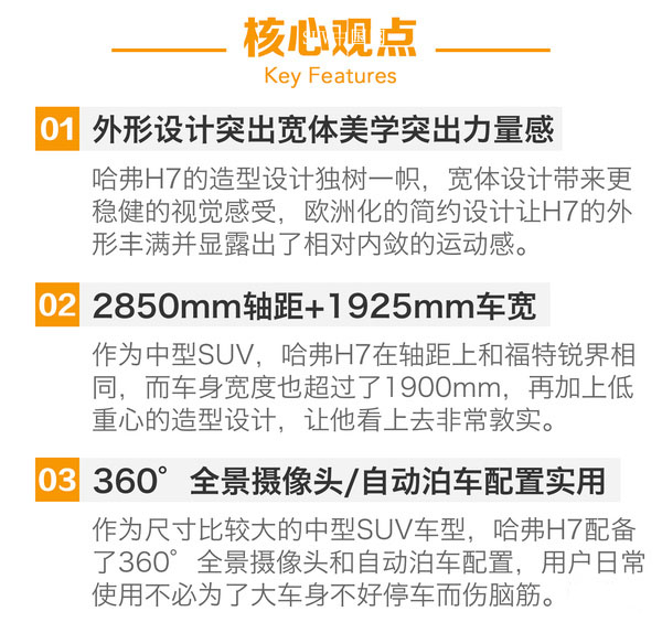 哈弗H7是長(zhǎng)城汽車應(yīng)用全新平臺(tái)開發(fā)的高品質(zhì)中型SUV,是一款介于時(shí)尚緊湊型SUV哈弗H6 Coupe和豪華中型SUV哈弗H8之間的產(chǎn)品,夸張的長(zhǎng)軸距以及大空間是他的特點(diǎn),他不僅是哈弗以大搏小越級(jí)競(jìng)爭(zhēng)規(guī)劃下的一款新車,也同時(shí)完成了哈弗產(chǎn)品的全線布局。這款主打大空間的中型SUV號(hào)稱同級(jí)別無對(duì)手,從數(shù)據(jù)和預(yù)計(jì)價(jià)格來看也確實(shí)如此,我們也期待著也許未來長(zhǎng)安CS95和廣汽傳祺GS8能跟他較量一番吧。
