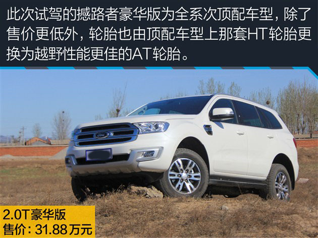 下面出場的這位相信大家都不會陌生,來自江鈴福特的撼路者,早前我們曾對撼路者2.0T旗艦型進(jìn)行過詳細(xì)的測試,而這一次我們拿到了售價31.88萬元的豪華版車型(次頂配)。除了售價、配置有較大的差別外,豪華版配備的倍耐力Scorpion ATR輪胎比頂配車型上那套HT輪胎有著更加出色的越野性能,究竟換胎能否帶來脫胎換骨的效果?