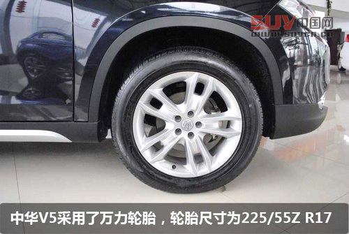 中華V5采用了萬力輪胎,輪胎尺寸為225/55Z R17。五幅的鋁合金輪轂造型較為時尚。