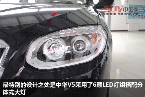最令人欣賞的是中華V5采用了6顆LED燈組搭配分體式大燈的設計,這讓整體看上去非常的顯檔次。位于保險杠兩側的霧燈則采用了較為常規(guī)的圓形設計,并在燈體周圍加以鍍鉻勾勒。前保險杠十分突出,給人一種厚重感和安全感。