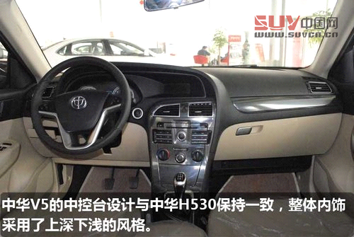 中華V5的中控臺設計與中華H530保持一致,整體內(nèi)飾采用了上深下淺的風格。
