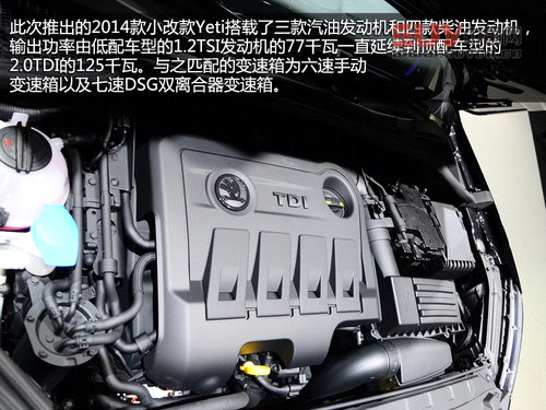 動力方面,此次推出的2014款小改款Yeti搭載了三款汽油發動機和四款柴油發動機,輸出功率由低配車型的1.2TSI發動機的77千瓦一直延續到頂配車型的2.0TDI的125千瓦。與之匹配的變速箱為六速手動變速箱以及七速DSG雙離合器變速箱。