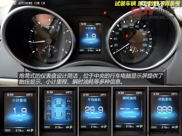 點(diǎn)火后的儀表盤是我們之前不曾見(jiàn)過(guò)的,炮筒式的造型搭配白色的背光簡(jiǎn)潔明朗,位于中央的彩色行車電腦顯示屏可提供胎壓、瞬時(shí)油耗以及小計(jì)里程等信息,并且所顯示數(shù)據(jù)均可呈現(xiàn)出一定的立體效果,視覺(jué)效果令人滿意。