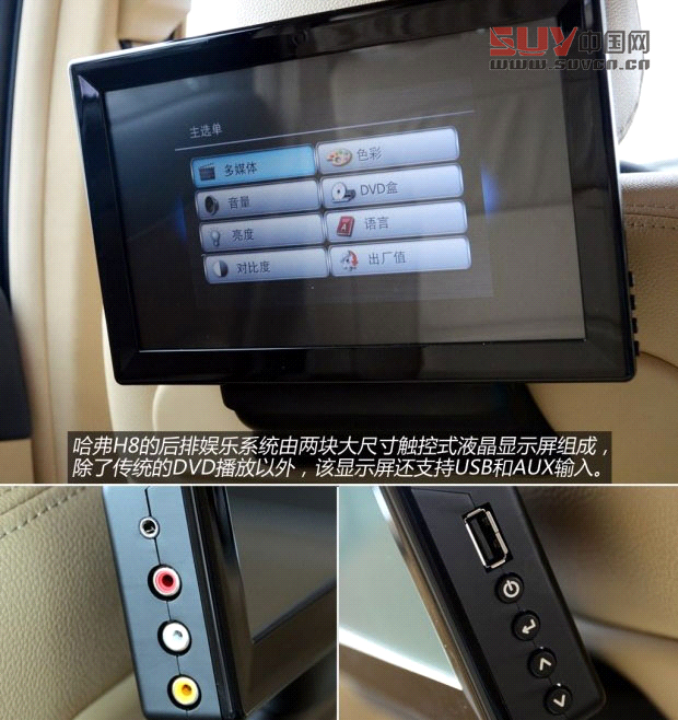 說(shuō)完了前排我們?cè)賮?lái)聊一聊哈弗H8的后排娛樂(lè)系統(tǒng),為了更好地與同級(jí)別車型競(jìng)爭(zhēng),哈弗H8為后排乘客提供了兩塊大尺寸觸控式液晶顯示屏。該顯示屏除了可以播放前排放入的DVD光盤,還可以讀取位于屏幕兩側(cè)的USB與AUX接口輸入的信號(hào),當(dāng)使用USB或AUX接口時(shí),后排的兩塊顯示屏能夠?qū)崿F(xiàn)獨(dú)立播放,互不干擾。