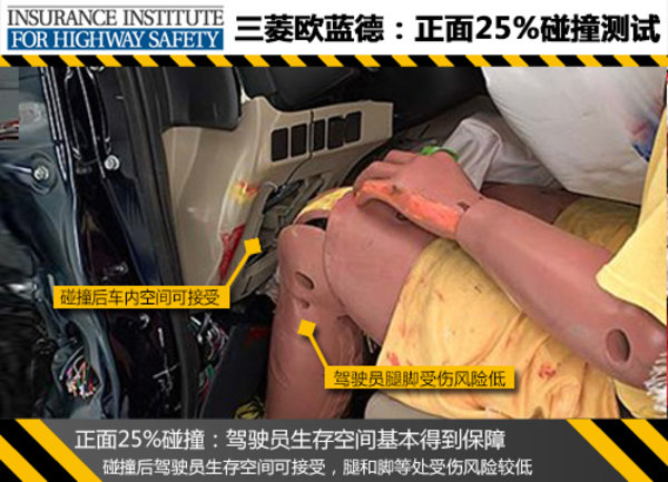 在更為嚴苛的正面25%碰撞測試中,三菱歐藍德雖然取得了總體評價良好的總成績,但其中結構評價項成績為“適中”。碰撞后安全氣囊和側氣簾及時彈出,對乘員頭部起到保護作用;車輛A柱及車頂已明顯變形、車門變形嚴重,盡管碰撞后駕駛員身軀各部位受傷害風險較低,但車身的結構強度仍需進一步提高;現代新勝達未公布正面25%碰撞成績。