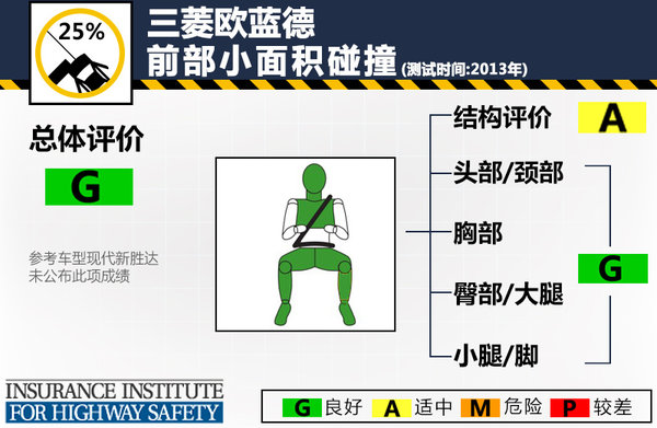 正面40%碰撞測試由于IIHS并未提供相應的圖片,以至于無法得到相關的圖像資料,但是從測試成績來看三菱歐藍德在這項測試中的各項成績均為“G”(良好),參考車型現代新勝達的正面40%碰撞成績同樣為良好。