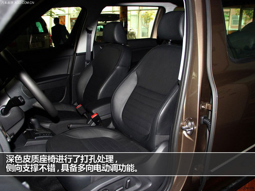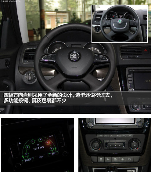 大圓套小圓的儀表設計,以及圓形刻度顯示,是典型的斯柯達風格,中央大尺寸液晶屏顯示信息豐富;四輻方向盤則采用了全新的設計,造型還說得過去,多功能按鍵、真皮包裹都不少。多媒體系統(tǒng)和空調操作都是標準的大眾風格。
