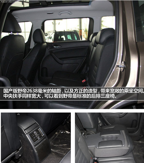 國產版野帝達到2638毫米的軸距,以及方正的車廂造型,帶來寬敞的內部乘坐空間。中央扶手同樣寬大,可以看到野帝是標準的后排三座椅。深色皮質座椅進行了打孔處理,側向支撐不錯,具備多向電動調功能。