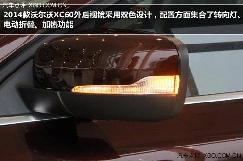 2014款沃爾沃XC60外后視鏡采用雙色設計,配置方面集合了轉向燈、電動折疊、加熱功能。