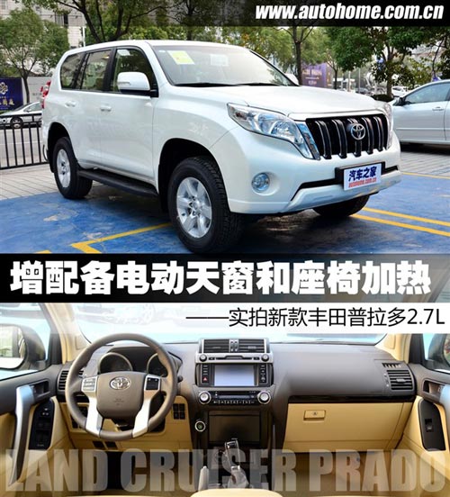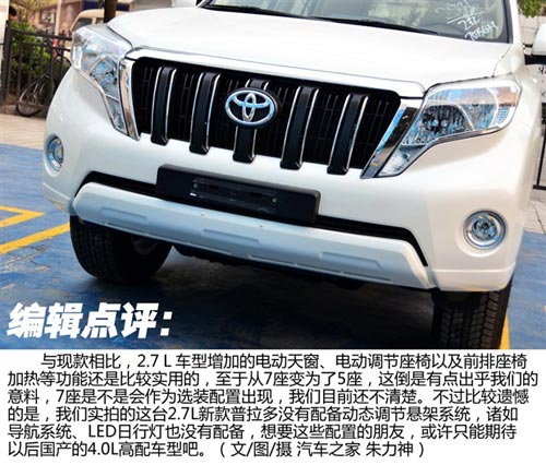 不久前,豐田發(fā)布了新款普拉多的官方圖片,從圖片上看,重新設計的前臉造型比現(xiàn)款更加夸張,能夠給人十分深刻的印象。而在配置方面,新款普拉多也在現(xiàn)款車型的基礎上增加了不少舒適性配置。近日,新款普拉多2.7L車型已悄然到店,并將于本周在廣州車展正式發(fā)布。它與老款相比,除了外觀造型有所不同外,對于2.7L車型而言,最大的亮點就是增配了電動天窗,可以說是彌補了老款2.7L車型全系沒天窗的遺憾。