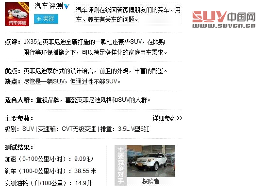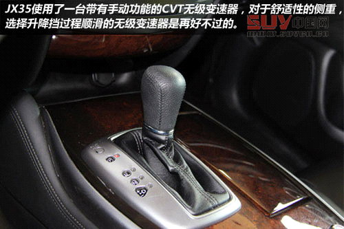 門光遠:(國內著名車手,新浪汽車專職試車手,多次參加著名的巴黎-達喀爾比賽。)JX35符合英菲尼迪家族式的風格,3.5L自然吸氣發動機匹配CVT無級變速箱,升降擋的過程平順自然,側重舒適性和實用性,前麥弗遜式后多連桿式的懸掛系統均帶有橫向穩定桿,接近5米的車身長度已經讓JX35具備了全尺寸SUV的特征。3.5L自然吸氣發動機的動力稱不上強勁,而是以線性的方式輸出,較為適合日常駕駛。