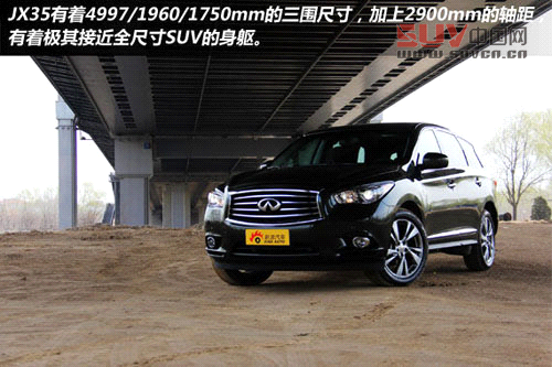英菲尼迪JX35有著4997/1960/1750mm的三圍尺寸以及2900mm的軸距,讓JX35有著極其接近全尺寸SUV的身軀,英菲尼迪家族式的中網,加上引擎蓋上獨特的突起曲線,很容易就可以辨認出這是一輛來自于英菲尼迪家族的車。