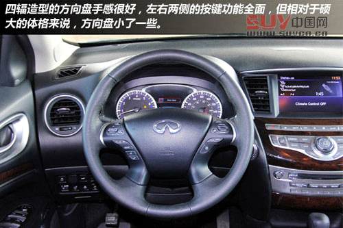 JX35的四輻方向盤造型飽滿,據之前試駕過這款車的同事描述,左右兩側的多功能按鍵功能非常豐富,細密的按鍵操作起來并不需要太大的動作,拇指范圍內即可完成自己想要的動作。真皮包裹的方向盤所提供的握感頗為不錯,但總感覺這個精致的方向盤尺寸偏小,和SUV龐大的身軀比起來,方向盤顯得不夠豪放。