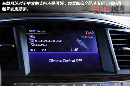 中控臺上方的諸多按鍵被放置的井井有條,排列組合的方式非常人性化,至于手感就更不用說了。液晶顯示屏的高度和位置讓駕駛者非常方便的就可以讀取到屏幕上的信息,也許是由于我們拿到的試駕車車載系統版本比較舊的原因,整個車載系統內一個漢字都沒有,甚至讀取U盤內MP3文件歌曲信息還出現了亂碼。