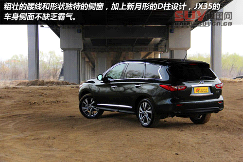 JX35的車身側面力量感十足,粗曠的腰線逐漸向上揚起,搭配厚重的車頂下沉式的線條,將車身的線條勾勒的很流暢,豐富的線條兼具了力量感和藝術感,相比以夸張的方式向外突出的前輪拱,后輪拱低調了不少。側窗前寬后窄的線條將JX35區別于其他SUV厚重敦實的強悍,多了一些靈動。新月形狀的D柱是JX35車身上的亮點,如果看見這樣的D柱,不用遲疑,你可以在最短的時間內判斷出這是一輛英菲尼迪JX35。