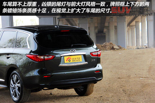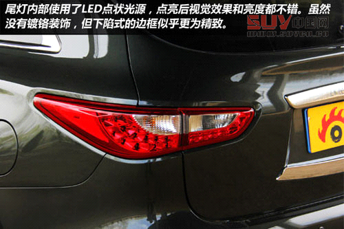 JX35的車尾亮點頗多,碩大的車尾沒有用大面積的尾燈來襯托車身的龐大,左右兩側與前大燈風格相似的全LED尾燈雖然尺寸不大,看起來挺兇狠,而且點亮的視覺效果和亮度都非常好。雖然尾窗的尺寸在同級別SUV當中不算太大,不過絲毫不會影響車內的視野和采光。