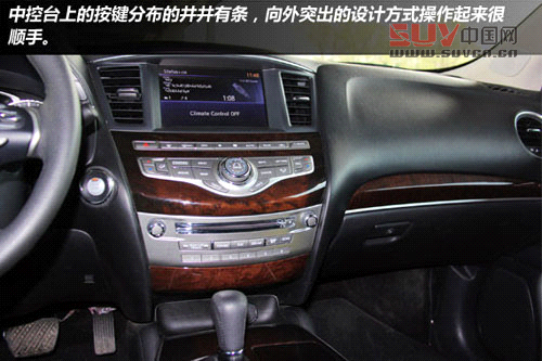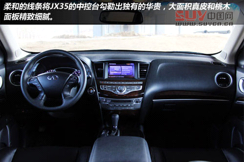 JX35的內飾符合英菲尼迪一直堅持的精致豪華,大面積的真皮和桃木材質被應用在中控臺上,用雍容典雅來形容并不過分。整體柔和的曲線將中控臺的形狀勾勒出一種獨有的華貴。