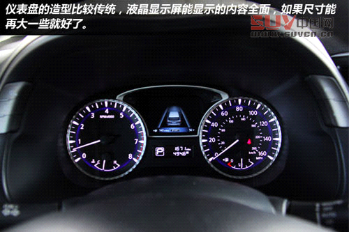 JX35采用了雙圓環儀表盤,配合白色的指針和讀數,搭配藍色背景光,需要注意的是,JX35的時速表,外圈是英里,內圈是公里,要是不小心把外圈錯讀成公里,恐怕超速罰單就會來了。中間的液晶顯示屏在能顯示車輛的相關信息,但尺寸顯得稍微小氣了一些,下方的小屏幕僅能顯示擋位和里程信息。