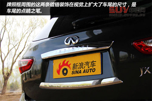 JX35的車尾稱不上厚重,卻從內向外的散發著一種“大”的氣質,而真正在視覺上擴大車尾尺寸的根源,是牌照框上下的兩條鍍鉻飾條。后保險杠相對JX35的車身尺寸來說小了一些,以至于車底的“風光”可以一覽無余,也讓JX35的視覺重心提高了一些,顯得有點頭重腳輕的味道。
