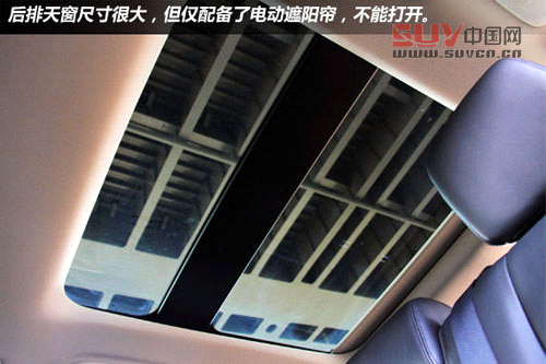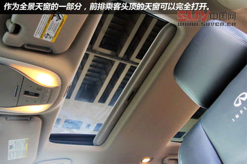 對于一輛大尺寸的SUV來說,全景天窗似乎是必不可少的裝備之一,而JX35的全景天窗尺寸也足夠的給力。一分為二的全景天窗靠前的一塊可以完全滑動開啟,而后排的全景天窗則是為了第二、三排乘客采光、欣賞風景用的,不能開啟。