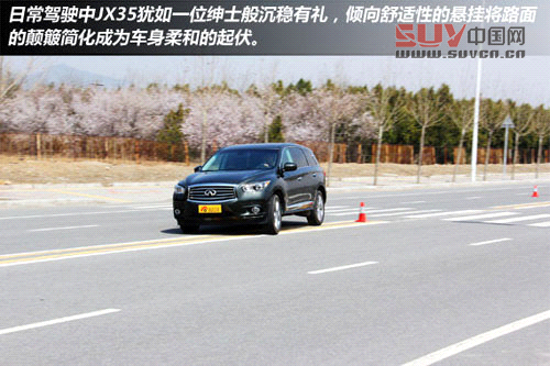 前面已經說過,3.5L自然吸氣發動機的動力輸出猶如一位紳士一般溫文爾雅,想得到起步的時候那種就像胸口受到重擊的壓迫感顯然是不太現實的,因此得到的好處就是JX35的起步姿態看起來與正常行駛無異,車頭不會高高的昂起,但發動機的轟鳴聲也足夠引起路人的注目了。