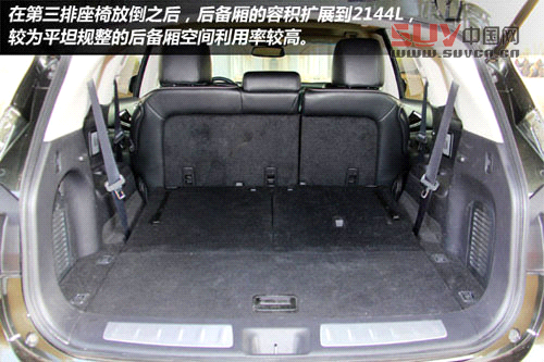 編輯點評:JX35有著全尺寸SUV的身段,擁有的空間絕對不會輸于轎車。將第二、三排座椅放倒之后,最大2144L的后備廂容積確實不小。