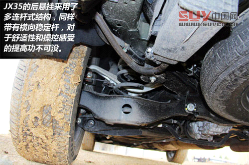 盡管體型龐大,可JX35的定位依舊是一輛7座多用途的城市SUV,所以完全越野風格的非承載式車身并沒有被應用在JX35上,承載式的車身得到的是更好的駕乘感受,前麥弗遜式獨立懸掛+后多連桿式獨立懸掛的組合是再合理不過的選擇,為了對舒適性的側重更進一步,前后懸掛添加了橫向穩定桿。
