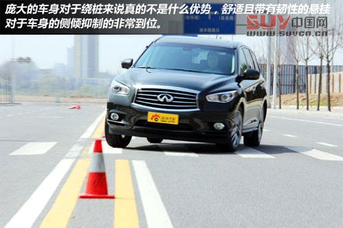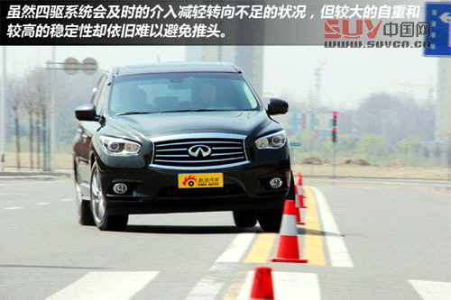 由于JX35的懸掛更多的傾向于舒適性,繞樁的時候得到的狀態不是特別理想,懸掛的柔軟幾乎覆蓋掉了韌性。盡管適時四驅系統介入的較為及時,但由于較大的自重,轉向不足的情況很難避免,誰又會讓乘客被晃的天旋地轉,拿這么一輛車去當性能車開呢?