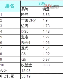 據中國汽車行業協會發布統計數據顯示,2013年9月我國SUV品牌銷量前十企業依次為:哈弗3.83萬輛、本田CRV 1.9萬輛、途觀 1.73萬輛、IX351.43萬輛、逍客 1.27萬輛、RAV4 1.06萬輛、翼虎 1.04萬輛、S6 1.02萬輛、Q5 0.97萬輛、漢蘭達 0.83萬輛。